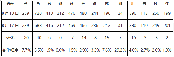 截至8月17日,重點監(jiān)測省份生產(chǎn)企業(yè)庫存總量為3906萬重量箱,較上周四庫存下降83萬重量箱,降幅2.08%,庫存環(huán)比降幅縮小7.71個百分點,庫存天數(shù)約19.11天,較上周減少0.40天(注:本期庫存天數(shù)以截至本周四樣本企業(yè)在產(chǎn)日熔量核算)。本周重點監(jiān)測省份產(chǎn)量1311.00萬重量箱,消費量1394.00萬重量箱,產(chǎn)銷率106.33%。